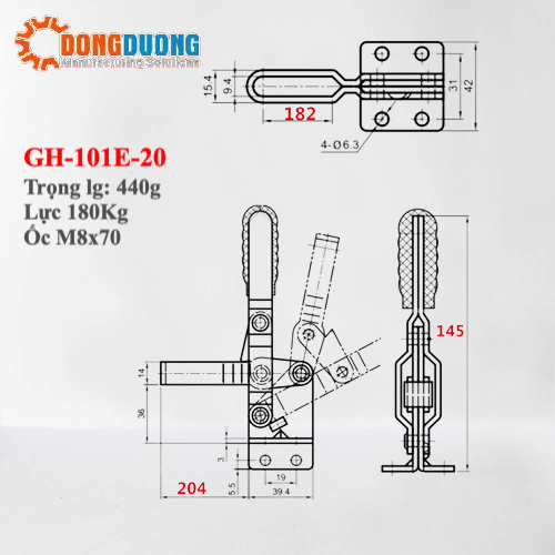 Cam kẹp GH-101EL-200 là cam kẹp đứng có cánh tay gá kẹp dài 200mm