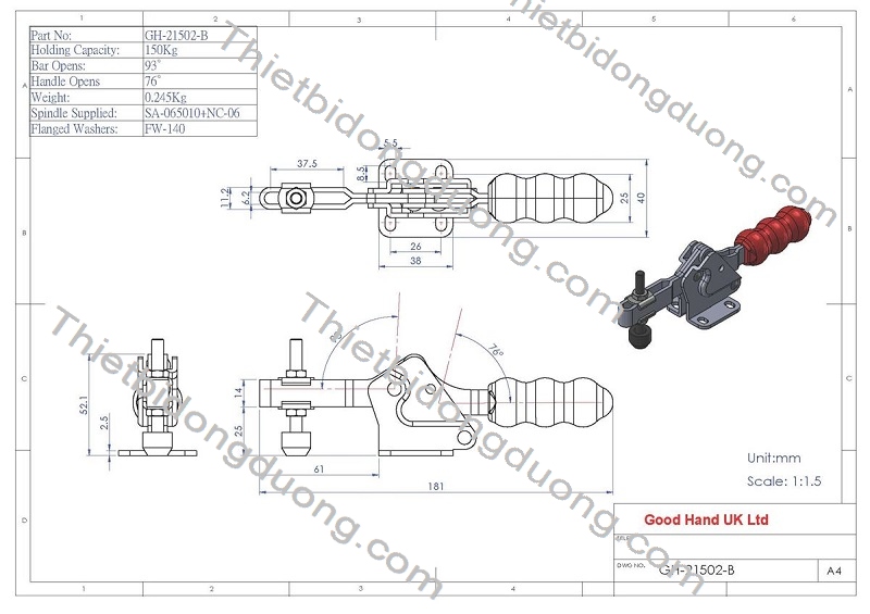 Bản vẽ kỹ thuật của sản phẩm và catalogue cam kẹp GH21502B: