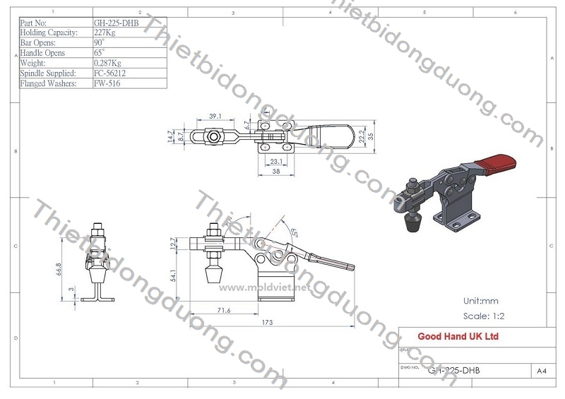 Bản vẽ kỹ thuật của sản phẩm và catalogue cam kẹp GH225DHB: