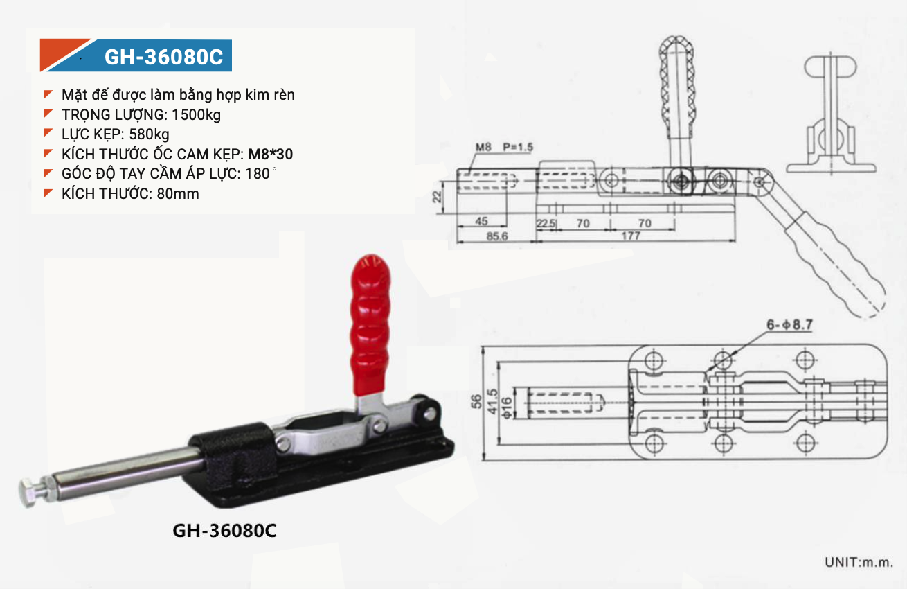 Cam kẹp đẩy GH36080C là thiết bị dùng trong xưởng sản xuất, dân dụng, công nghiệp .. đẩy định vị theo hưởng đẩy tịnh tiện giữ chặt chi tiết sản phẩm.