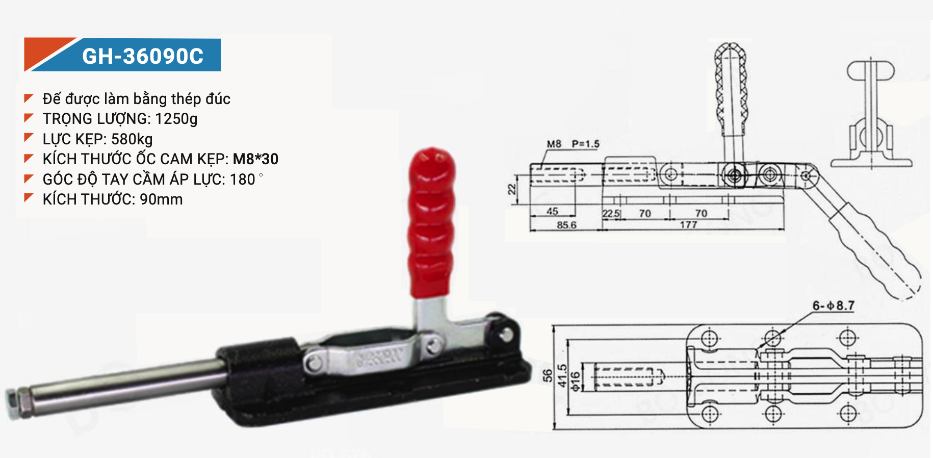 Cam kẹp đẩy GH36090C là thiết bị dùng trong xưởng sản xuất, dân dụng, công nghiệp .. đẩy định vị theo hưởng đẩy tịnh tiện giữ chặt chi tiết sản phẩm.