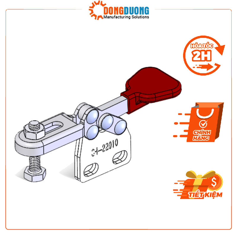 Kẹp định vị CH-22010 thương hiệu clamptek Đài Loan, là dạng kẹp nhanh với mỏ kẹp nằm ngang theo song song với chiều bắt kẹp, chuyển đổi lực kẹp nhờ tác động vào tay kẹp nhanh, Kẹp được sử dụng trong hệ thống máy móc jig đồ gá, xưởng sản xuất. Được nhập khẩu và phân phối bởi công ty Đông Dương