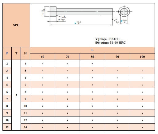 Chày đột lỗ SPC là linh kiện khuôn dập dùng để đột lỗ trong, vật liệu skd11 có độ cứng cao, cung cấp tại Hà Nội, là vật tư dùng trong các bộ khuôn đột dập, sản phẩm được thiết kế dạng chốt thẳng, độ cứng cao như thép gió, để dễ dàng đột dập lỗ trên tấm kim loại.