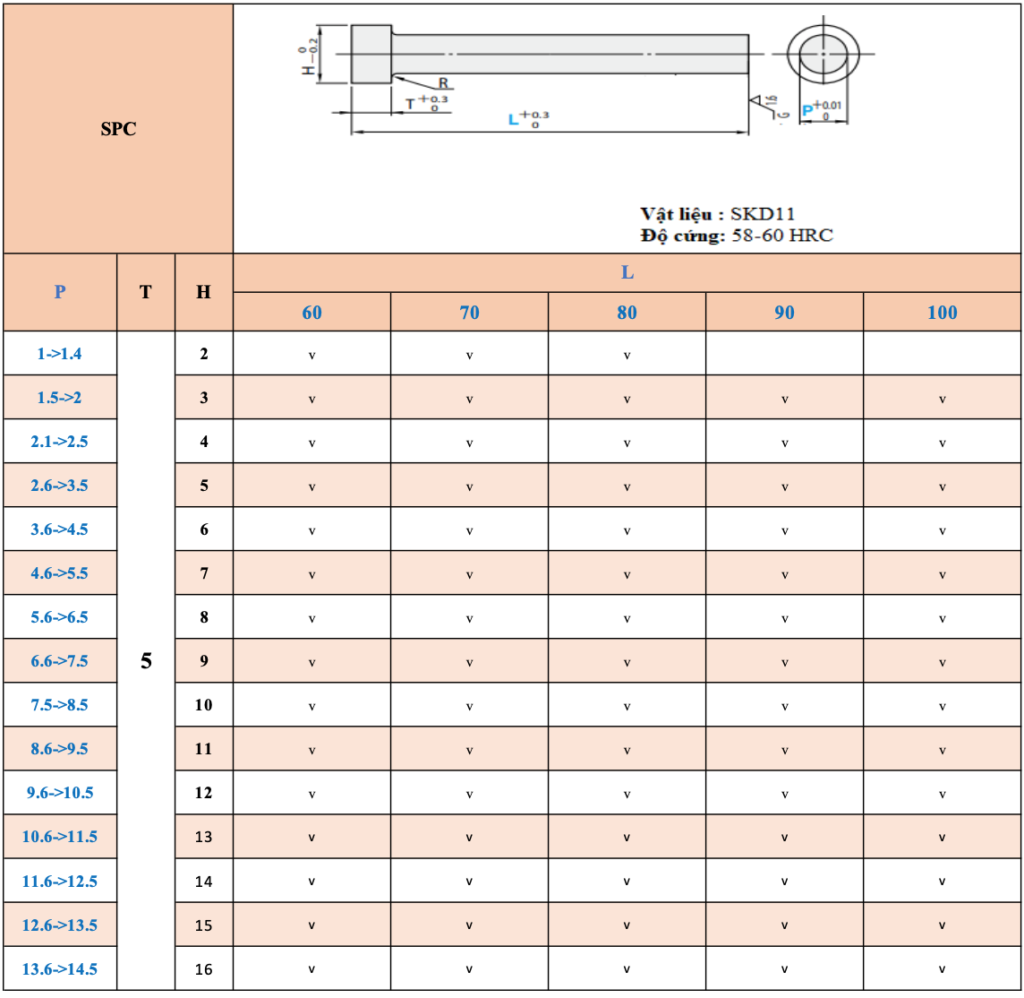 Chày đột lỗ SPC là linh kiện khuôn dập dùng để đột lỗ trong, vật liệu skd11 có độ cứng cao, cung cấp tại Hà Nội, là vật tư dùng trong các bộ khuôn đột dập, sản phẩm được thiết kế dạng chốt thẳng, độ cứng cao như thép gió, để dễ dàng đột dập lỗ trên tấm kim loại.