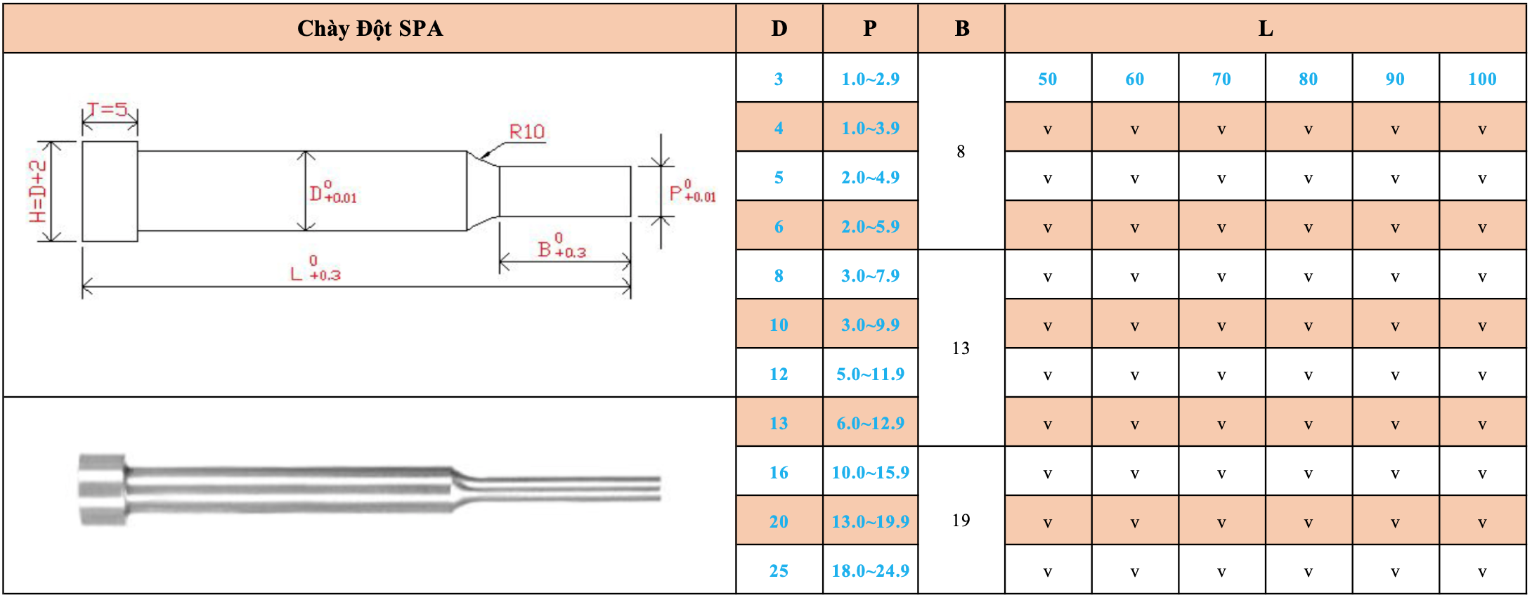 Chày đột bậc SPA là phụ tùng khuôn đột dập được sản xuất trên máy móc hiện tại, đạt độ chính xác cao, đáp ứng yêu cầu của khách hàng.