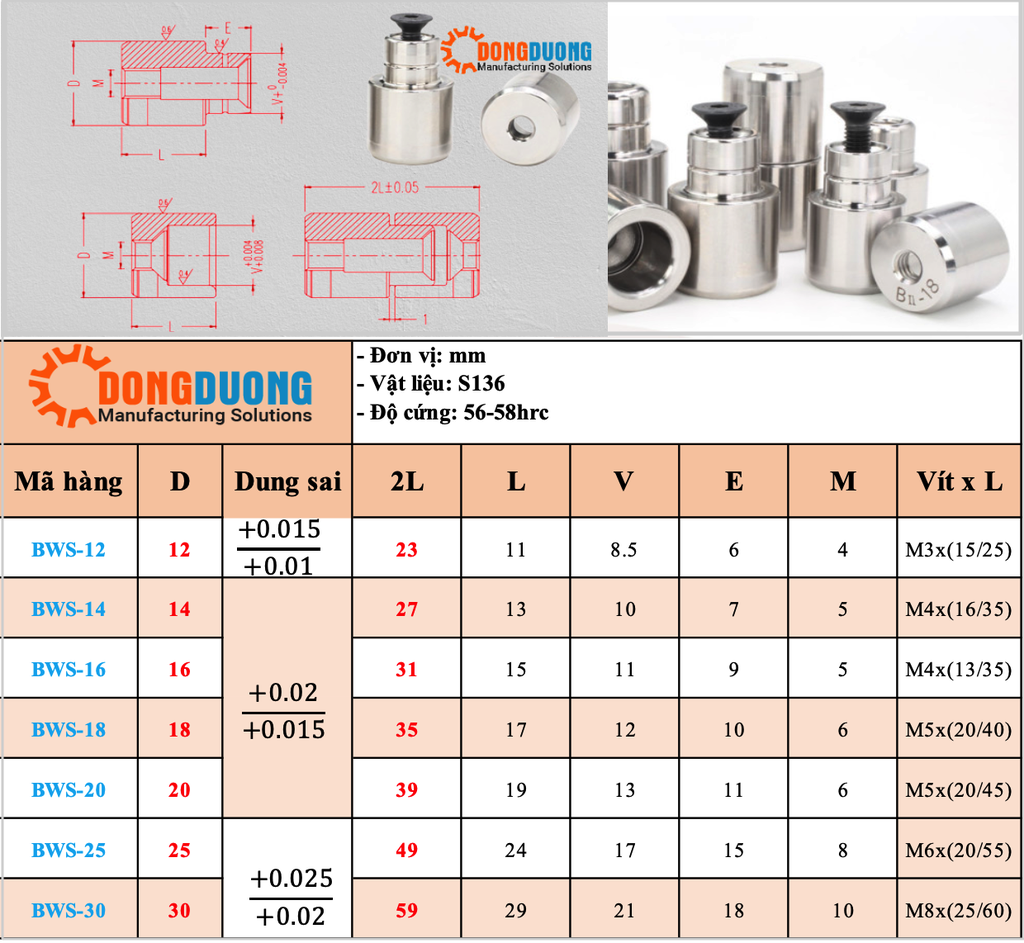 Bản vẽ kích thước chốt định vị khuôn BWS: