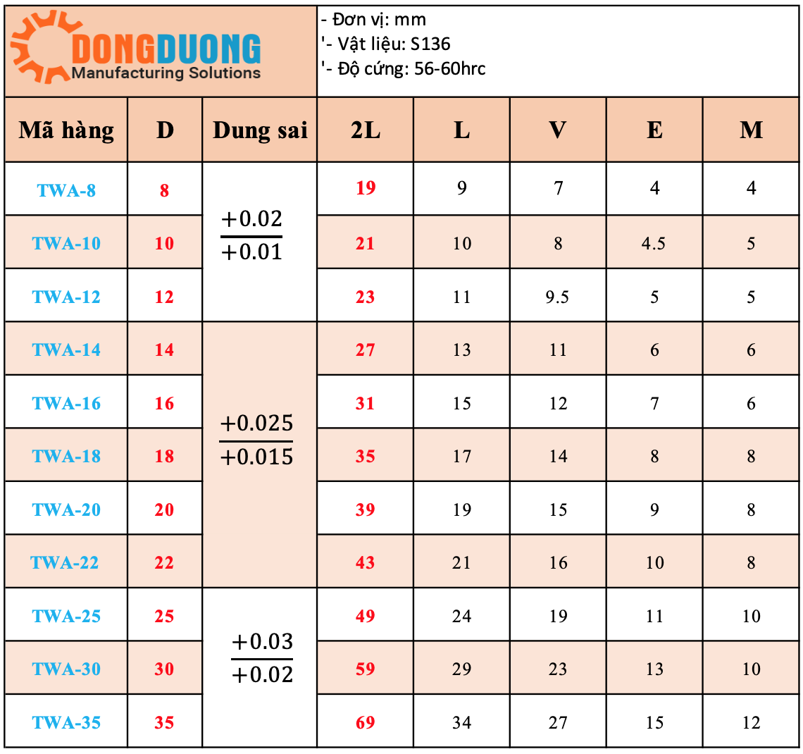 Chốt định vị côn TWA là linh kiện khuôn mẫu, được sử dụng trong khuôn thổi, khuôn nhựa để định vị vị trí 2 nửa khuôn, tác dụng chính xác.