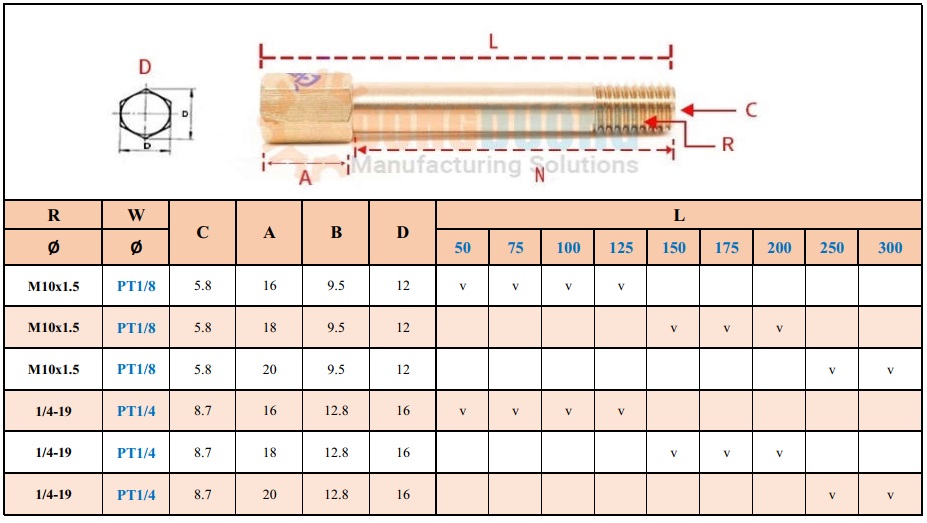 - Một đầu ren ngoài PT1/8 hoặc 1/4 và một đầu ren trong tương ứng PT1/8 , PT1/4 để nối với đầu cút nước.